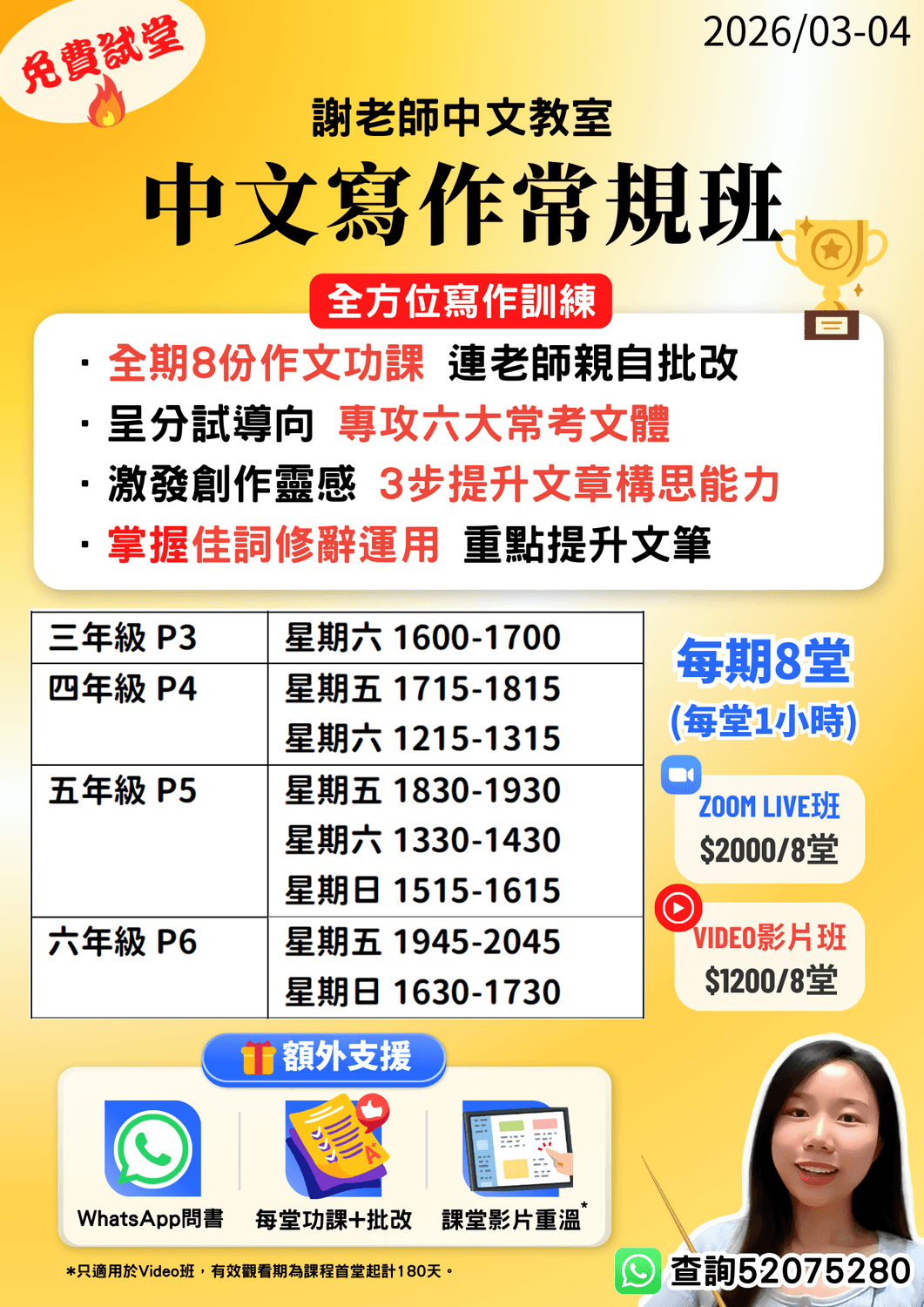 關於課程的大部分資訊,可以在這裡找到。如有其他疑問,歡迎WhatsApp52075280查詢。